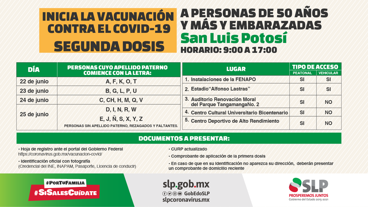 gobierno de slp on twitter atencion del 11 al 15 de mayo se aplicaran las segundas dosis de vacuna contra el covid19 a personas a partir de los 60 anos residentes