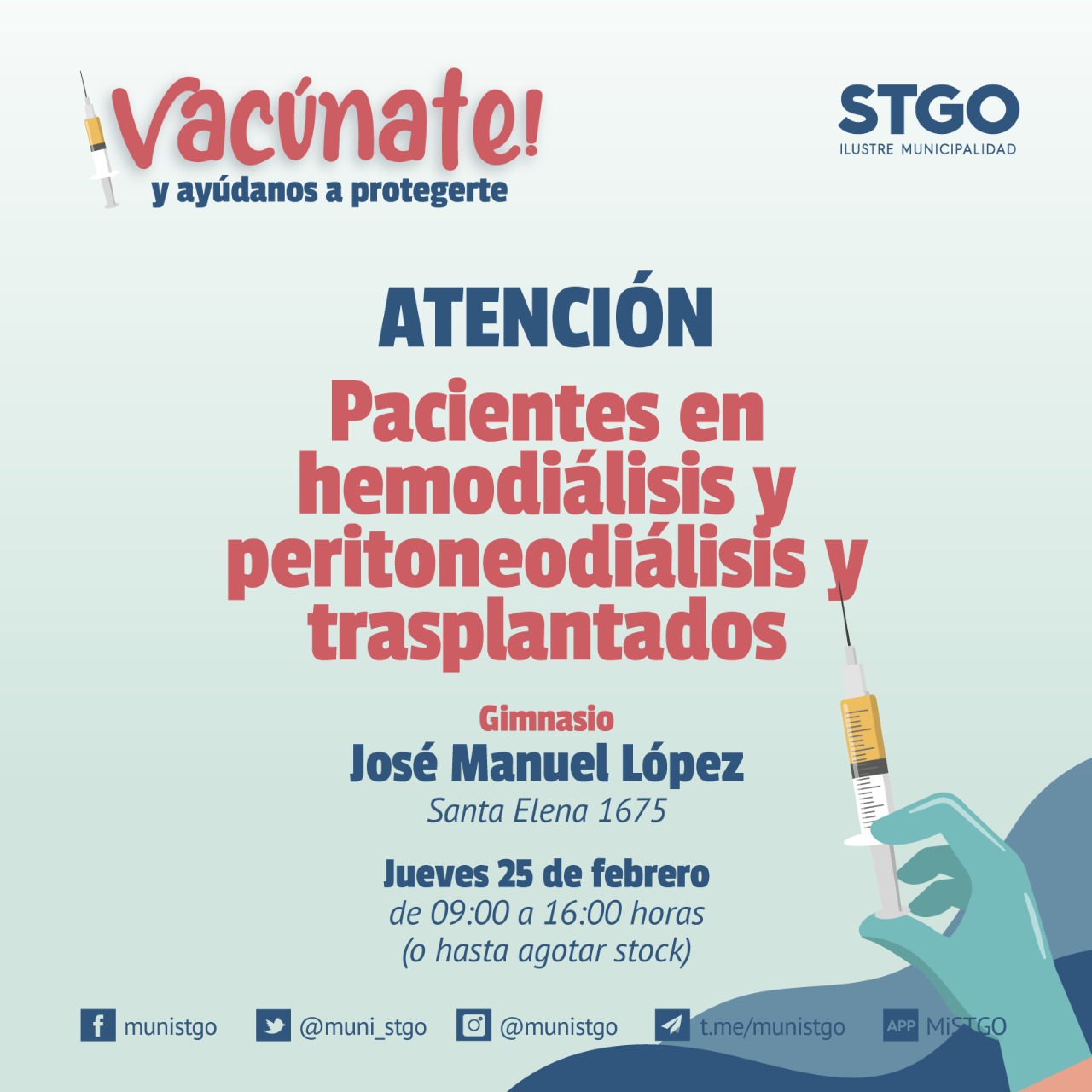 santiago no twitter santiago atencion a la vacunacion covid 19 para pacientes en hemodialisis peritoneodialisis y trasplantados hoy 25 de febrero en el gimnasio jose manuel lopez santa elena 1675 de 9 00