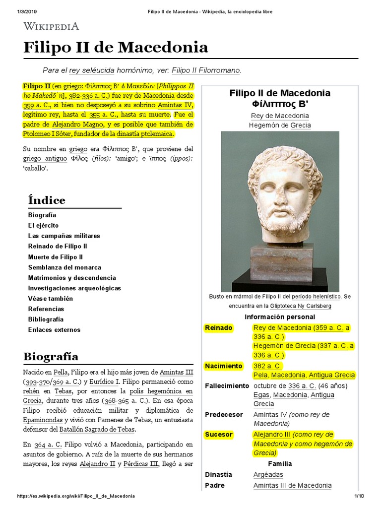 filipo ii 382 336 a c fue rey de macedonia desde 355 a c hasta su muerte fue el padre de alejandro magno y sus hazanas allanaron el camino de la gloria