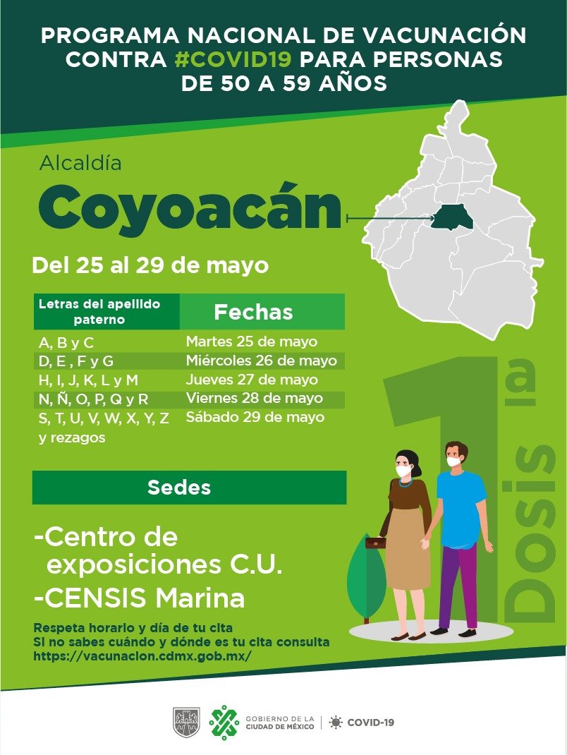 gobierno cdmx en twitter conoce las fechas para la vacunacion contra covid19 para personas entre 50 y 59 anos de las alcaldias alvaro obregon azcapotzalco benito juarez coyoacan miguel hidalgo tlalpan